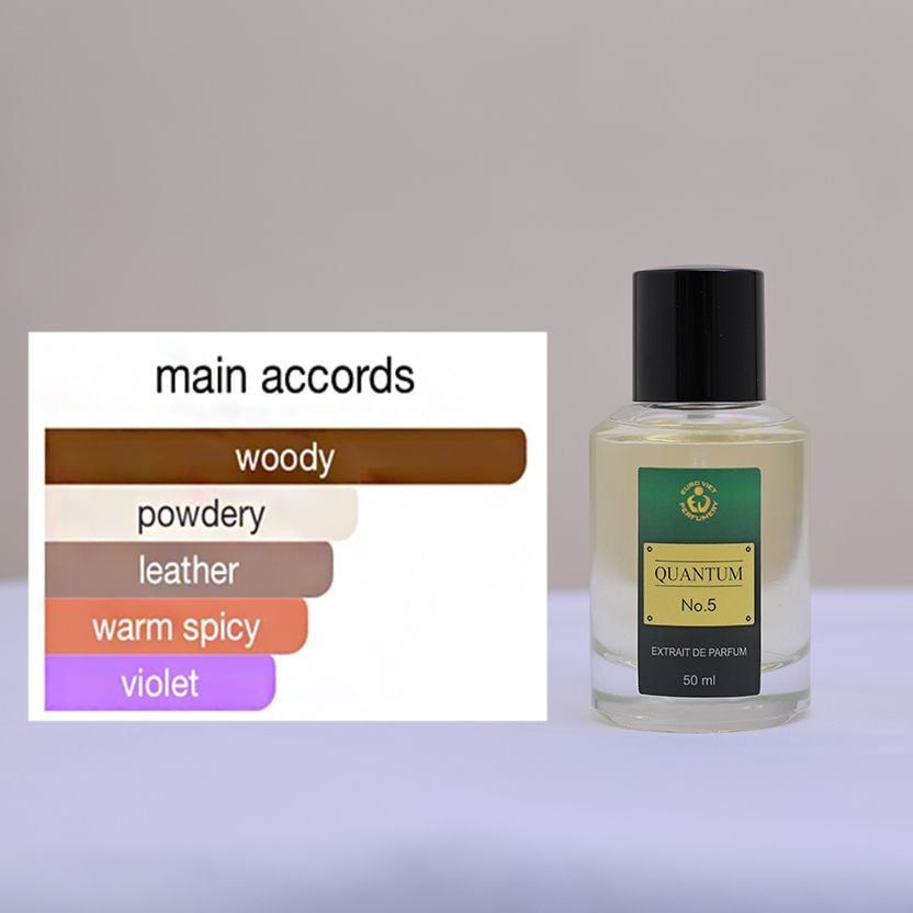 Cái không khí ấy là sự tổng hòa của rất nhiều các nốt hương được hoàn quyện hài hòa dưới bàn tay của nghệ sỹ điều hương Frank Voelkl, từ chủ điểm Gỗ đàn hương, thêm chút Lá cói để tạo ra hiệu ứng gỗ tươi, cùng Da thuộc để làm đanh cái không khí lại cho giống với một xưởng gỗ và những bụi gỗ được tạo ra từ cảm giác phấn bụi của Diên vĩ và Violet. Mọi thứ được sắp xếp một cách ngăn nắp và ẩn chứa rõ ý đồ trong từng note hương Quantum N0.5 , tạo thành nét ấn tượng đem tới thành công cho mùi hương này.