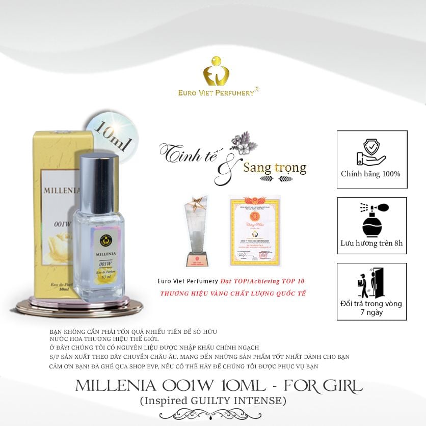 MIÊU TẢ: Nước hoa MILLENIA 001W (Inspried by Gucci Guilty Intense) được sáng tạo với hương thơm gợi cảm và khiêu khích hơn, mang trong mình hương thơm nồng nhiệt và ấm áp.