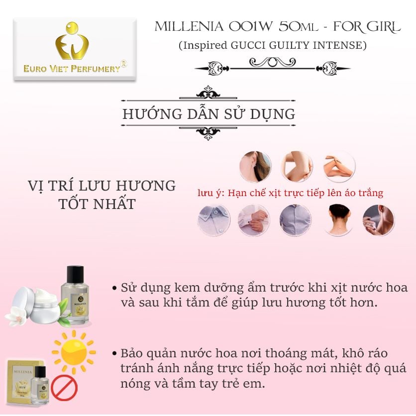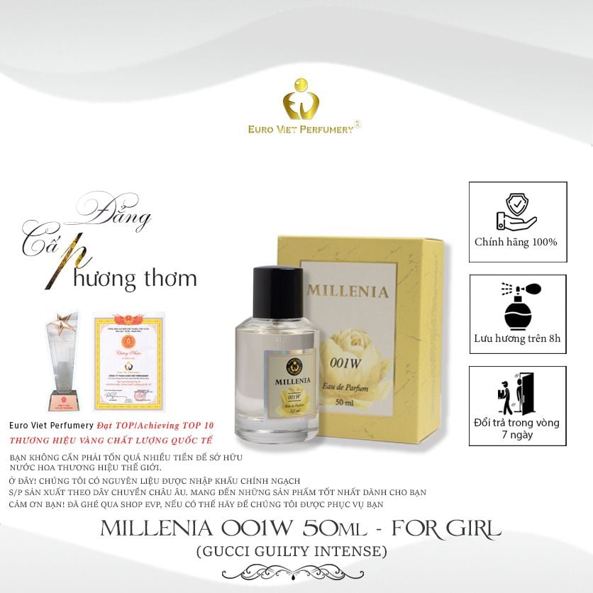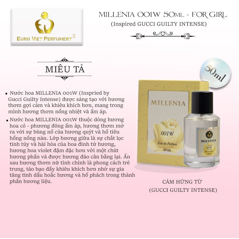 MIÊU TẢ: Nước hoa MILLENIA 001W (Gucci Guilty Intense) được sáng tạo với hương thơm gợi cảm và khiêu khích hơn, mang trong mình hương thơm nồng nhiệt và ấm áp.