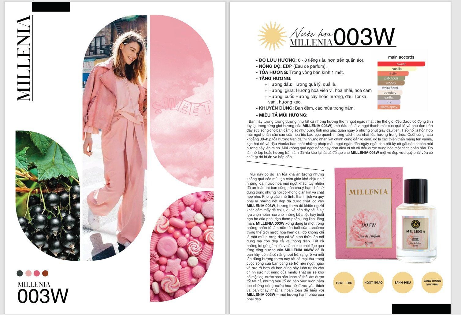 MILLENIA 003W sở hữu hương trái cây tinh khiết cùng sự ngọt ngào của hạnh nhân, hương vani, đậu Tonka quyện cùng hương thơm mát, thanh lịch của hoa Viên vĩ, hoa Nhài, hoa Cam mang đến cho quý cô sự mềm mại mà xinh đẹp lâu dài.