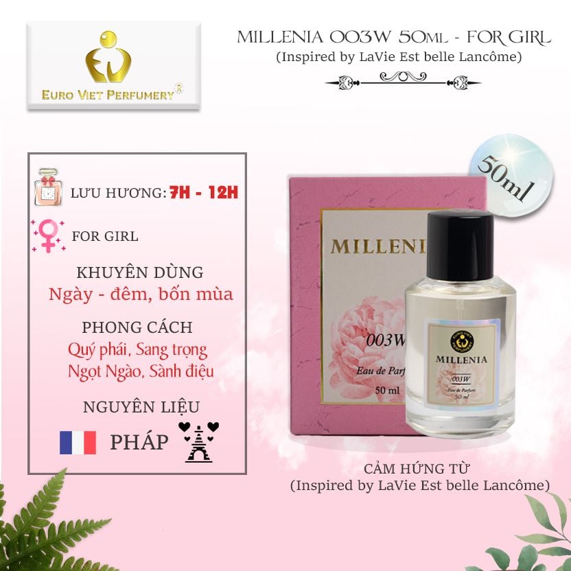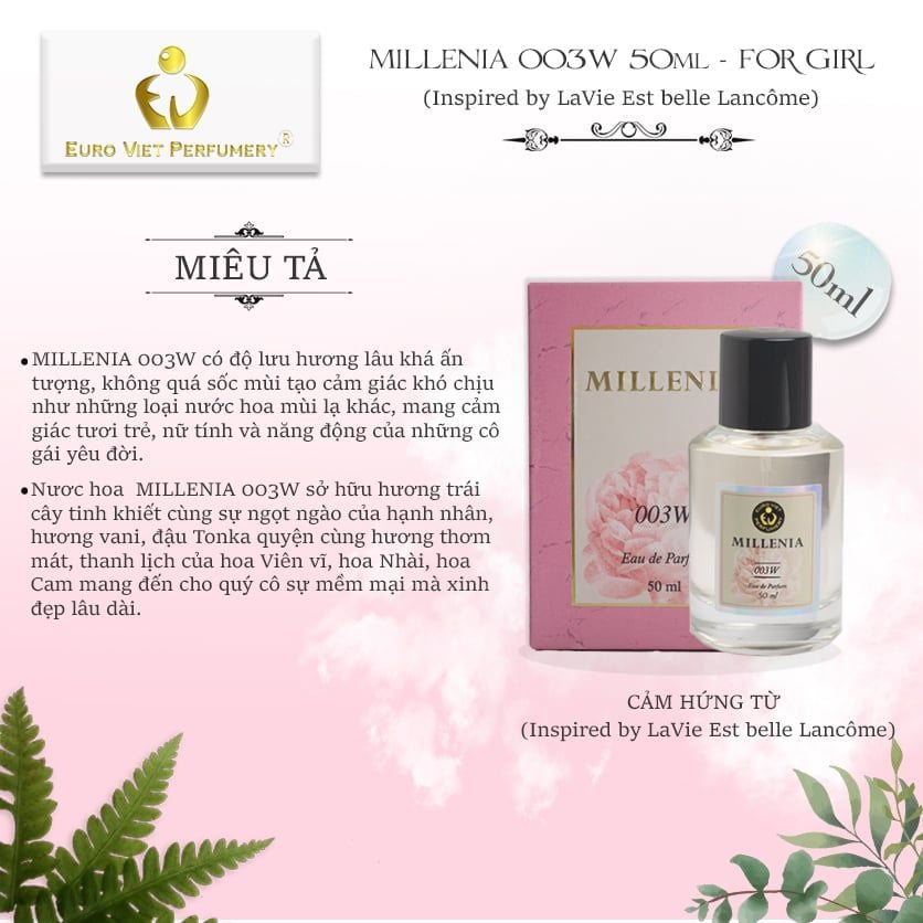 - Miêu tả: MILLENIA 003W có độ lưu hương lâu khá ấn tượng, không quá sốc mùi tạo cảm giác khó chịu như những loại nước hoa mùi lạ khác, mang cảm giác tươi trẻ, nữ tính và năng động của những cô gái yêu đời.
