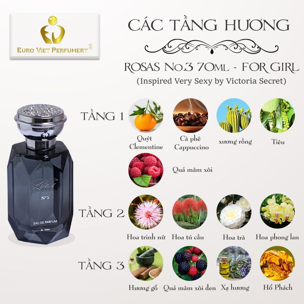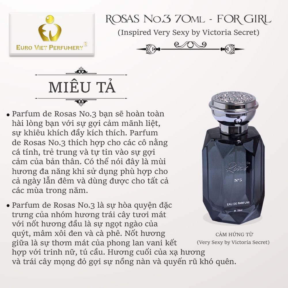 - MIÊU TẢ: Nếu như Parfum de Rosas No.1 đại diện cho sự quyến rũ nhẹ nhàng, Parfum de Rosas No.2 cho sự sang trọng thì đến Parfum de Rosas No.3 bạn sẽ hoàn toàn hài lòng với sự gợi cảm mãnh liệt, sự khiêu khích đầy kích thích. Parfum de Rosas No.3 thích hợp cho các cô nằng cá tính, trẻ trung và tự tin vào sự gợi cảm của bản thân. Có thể nói đây là mùi hương đa năng khi sử dụng phù hợp cho cả ngày lẫn đêm và dùng được cho tất cả các mùa trong năm