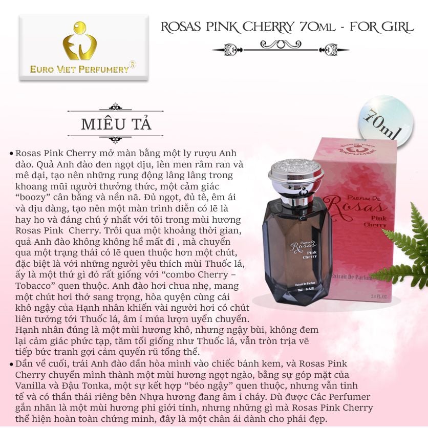 ROSAS PINK Cherry sẽ đem tới cho chúng ta một trải nghiệm thú vị, về những gì mà ngành công nghiệp thơm có thể làm với quả Anh đào (Cherry). Để rõ hơn, hãy tận hưởng mùi hương mới của nhà EURO VIET , để xem một trái Cherry nhỏ bé có thể làm được những gì với khứu giác của chúng ta.